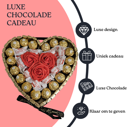 In het midden van de hartvormige doos liggen 20 Ferrero Rocher bonbons, omringd door maar liefst 30 Merci chocolaatjes. Afgewerkt met een mooi zwart/goud satijnen lint.